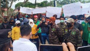 “Ketua sedang menghadiri undangan penyerahan LHP 2020 di BPR RI propinsi. Sedangkan wakil sedang menghadiri undangan di Bandung,” terangnya kepada para pendemo dengan pengeras suara.