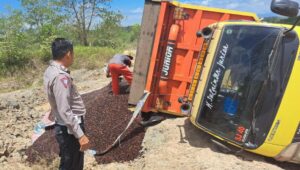 Bergelombang, Truk Kembali Terbalik di Jalan Alternatif KM 171 Satui
