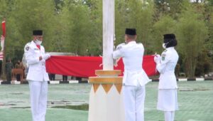 Tanah Bumbu, lenterabanua.com – Upacara pengibaran dan penurunan bendera Sang Saka Merah Putih dalam memperingati HUT Kemerdekaan RI Ke76 di halaman Kantor Bupati Tanah Bumbu, berjalan lancar, Selasa (17/8/2021).