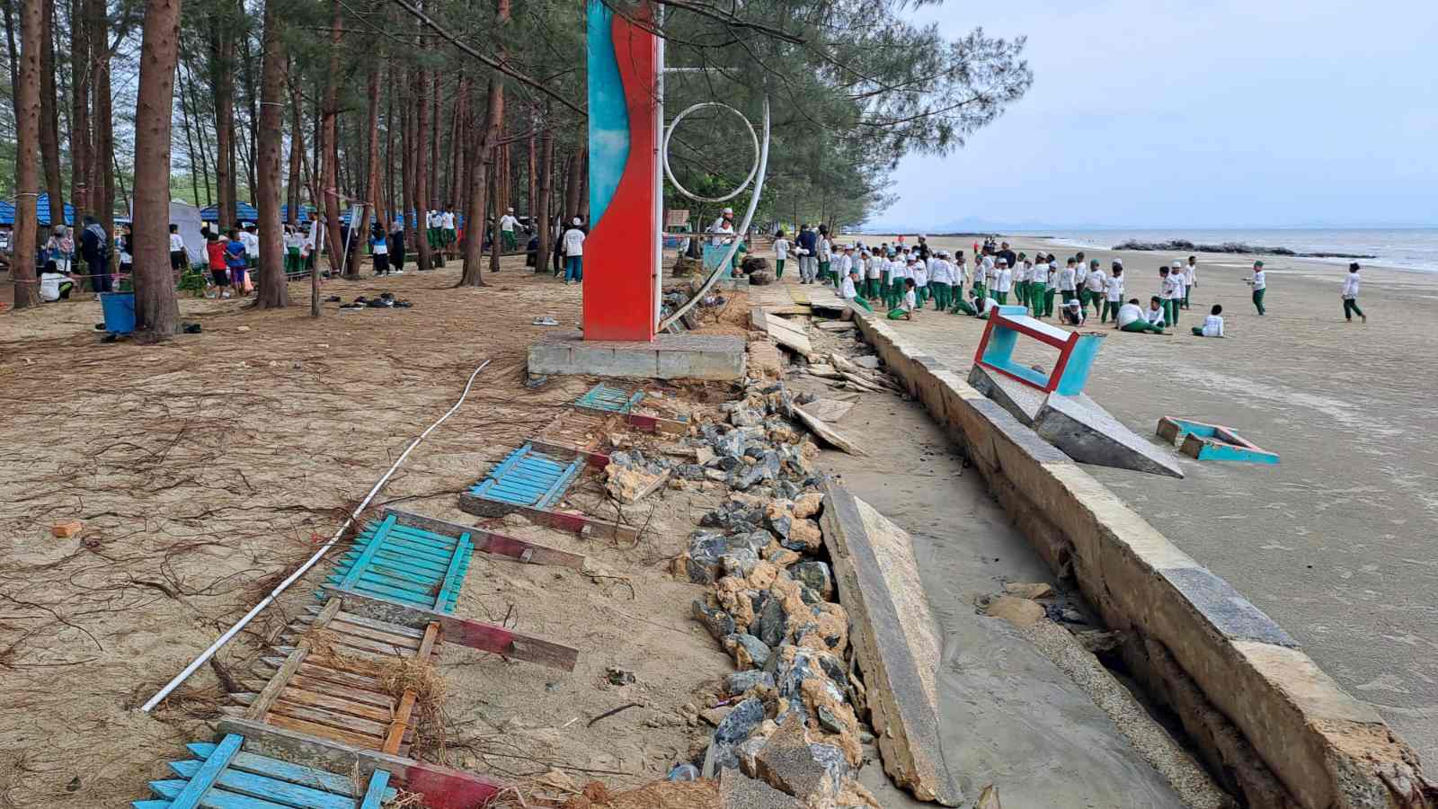 “Selain dihantam gelombang, air laut yang naik hingga ke jalan mendorong lagi sejumlah fasilitas ke arah laut hingga mengalami rusak parah,” beber dia.