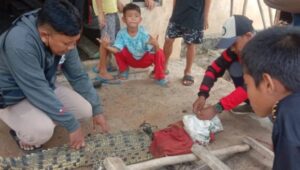 Tanah Bumbu, lenterabanua.com – Warga Desa Sepunggur Kecamatan Kusan Tengah Kabupaten Tanah Bumb dibuat geger. Pasalnya seekor buaya lagi-lagi masuk perangkap ikan warga.