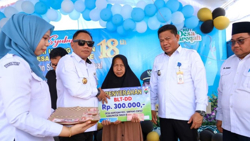 Peringatan HUT Desa Baroqah tahun ini ditandai dengan pemotongan tumpeng, penyerahan santunan anak yatim, dan penyaluran Bantuan Langsung Tunai (BLT). [mctb]