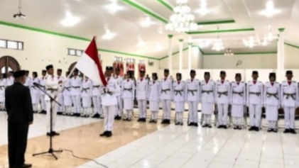 WAKIL Bupati Kabupaten Tanah Bumbu, Muh Rusli melaksanakan Pengukuhan Pasukan Pengibar Bendera Pusaka (Paskibraka) Tanah Bumbu Angkatan XIX Tahun 2022 , bertempat di Gedung Mahligai Bersujud Kapet, Senin (15/8/2022).