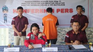 Kepala Divisi Keimigrasian Kantor Wilayah Kemenkumham Kalsel, Junita Sitorus, didampingi Kepala Kanim Kelas II TPI Batulicin, I Gusti Bagus M Ibrahim, Kamis (17/8/2023) gelar konferensi pers.