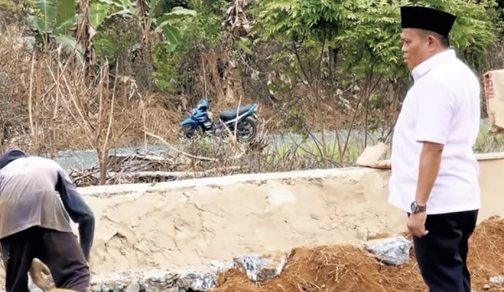 H Hasanuddin juga terjun langsung meninjau kondisi lapangan sepekbola yang saat ini berproses pembangunan dan sebentar lagi bakal ditanami rumput.