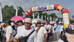 Peserta Jalan Sehat Batfest 2023 saat memasuki gerbang finish di lapangan Pantai Festival Jhonlin di Sungai Kecil, Kecamatan Simpang Empat, Kabupaten Tanah Bumbu.