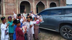 Seperti aksinya, Jumat (23/6/2023) kemarin di Masjid Desa Sumberwangi, Kecamatan Karang Bintang, Kabupaten Tanah Bumbu. Gerakan berbagi Yayasan Segaris Senyum Gemilang, membuat puluhan bocah di desa tersebut sumringah
